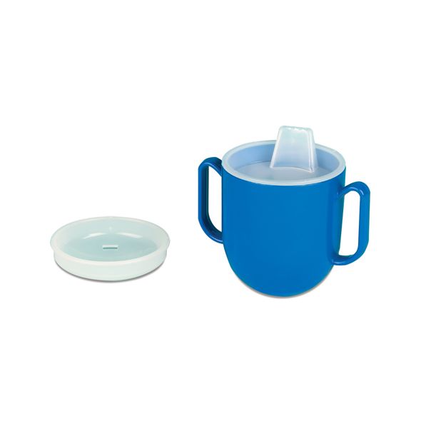 Two-handled cup with weighted base and rounded corners is ideal for pediatric use * It is self-righting even when released from a lying position * It comes with a clear plastic dish-shaped lid with two holes to let fluid flow into the dish for drinking * Another lid has a molded plastic * mouthpiece * Top shelf dishwasher safe * Has 6 1/2? oz. (192 mL) capacity * Spill proof *