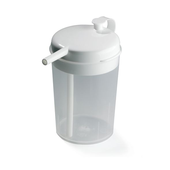 Specifically designed to eliminate the need to sit up or raise the head while drinking * Fluid will not spill from the cup even if it is lying on its side * Closing the valve on the lid stops the flow of fluid and gives the user control of intake amount by sucking on the spout * Ideal for people who are confined to bed need to drink lying down or who have limited neck/head mobility * Helps reduce the risk of choking promotes independent drinking and reduces caregiver assistance * Engraved measurement markings in 25 ml increments * Use with hot and cold fluids * Holds 8.5 oz. (250 ml) * Dishwasher autoclave and microwave safe * Comes with 11 straws * Cup: diameter - 2 7/8 (7.3 cm) overall height - 4 5/8 (11.7 cm) spout length - 1 1/2 (2.7 cm) volume - 8.5 oz. (250 ml)- Straw: outside diameter - 1/4 (.64 cm) length - 3 21/32 (.93 cm) * Warranty: 12 months parts and labor