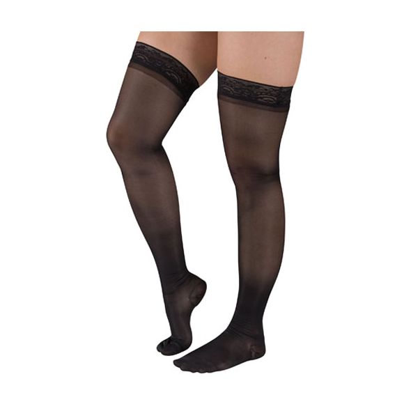 Blue Jay Brand * Black * Ladies Sheer Firm Support * Thigh Length w/stay-up lace top * 20-30 mmHg * Physician recommended relieves tired aching and swollen legs mild varicosities and edema * Effective as post sclerotherapy treatment * Fashionable sheer appearance for work or leisure * Two way stretch design provides extra comfort * Stay up lace top * Reciprocated heel and toe * Graduated compression helps shape-up legs * Fiber content: Nylon (80%) & Spandex (20%) *