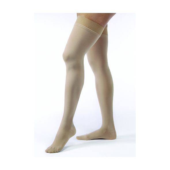 Thigh High (Closed Toe) * 15-20 mmHg * Silky Beige  * Medium * Ankle Circumference 8 3/8  - 9 7/8  * Calf Circumference 11 7/8  - 16 1/2  * Thigh Circumference 18 1/8  - 27 1/2   Stylish leg therapy that is easy-to-don for soft and comfortable year-round wear * Made with a combination of silicone-blend finish  multifiber yarn and 3D knit structure * Cool and breathable  which makes it comfortable to wear any time of the year * Guaranteed compression - 15-20 mmHg  20-30 mmHg  40 mmHg - for optimum medical efficacy using multifiber yarns for the softest feel * The reciiprocated and reinforced heel allows for greater durability and lasting comfort * Jobst? Opaque? conceals blemishes  varicose veins and scars * Thigh high  Waist high and Knee high styles * Size: 9 L x 6 W x 4 H *  Now available in luxuriously smooth  non-ribbed style * Latex free